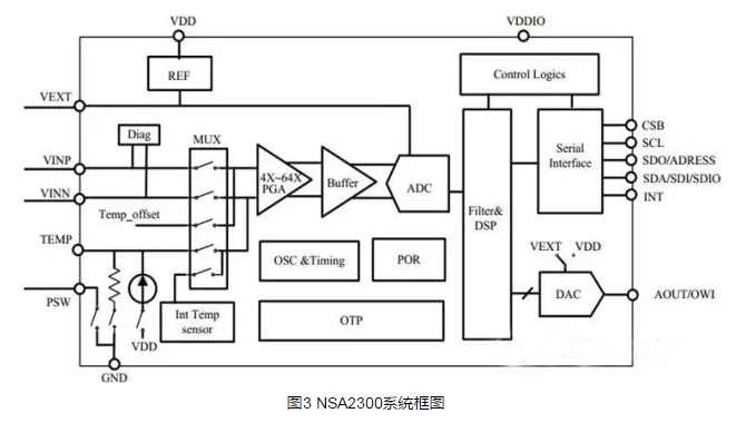 传感器信号调理芯片通常可以提供对前端传感器采集数据进行放大、校准和温度补偿的功能,从而使得传感器器件具有稳定可靠进行工作,并且使得器件之间具有良好的一致性。除使用集成式的信号调理芯片外,传统方案也可以使用外围分立电路来实现传感器的校准与标定,但效率低下,且效果依赖于人工与经验,不适于规模生产。而通过信号调理芯片的使用,能够免除手工校准的繁杂工作,并且提高传感器器件的可靠性。常见的桥式信号调理芯片型号包括德国ZMDI公司的ZSC31010,美国美信公司的MAX1452,以及苏州纳芯微电子公司的NSA2300。接下来本文将以NSA2300为例介绍信号调理芯片对传感器进行校准的相关说明。NSA2300为一款专为桥式传感器提供的高集成、低功耗、高精度的传感器信号采集、放大和校准的传感器接口芯片,可以用于压力传感器调理,磁传感器调理,各类应变式传感器接口等。NSA2300可为传感器提供零点偏移及其温度补偿,灵敏度及其温度补偿以及非线性补偿,不需要其他额外的外部器件支持。NSA2300还提供多种温度测量模式,同时支持I2C/SPI数字输出和模拟输出,并可通过复用模拟输出引脚(AOUT)进行单线数字通讯(OWI)。